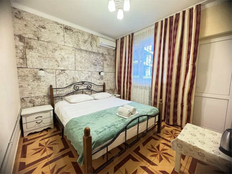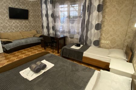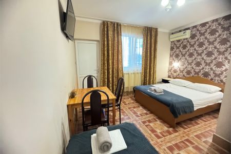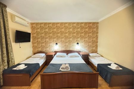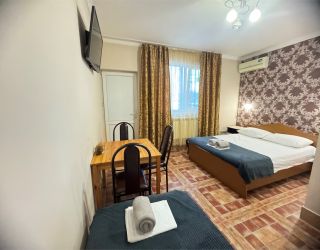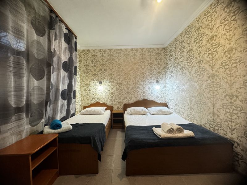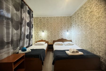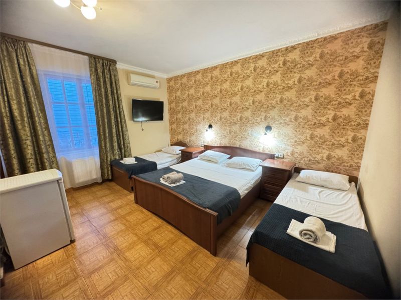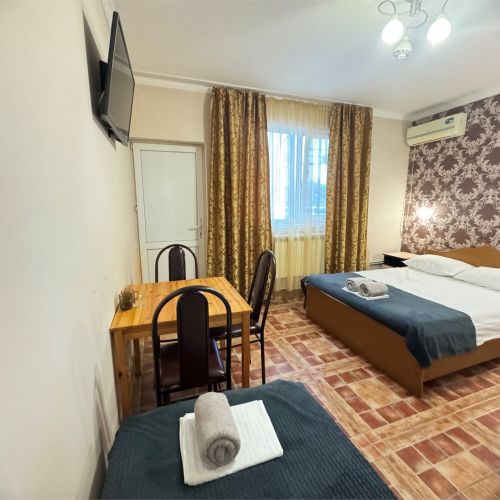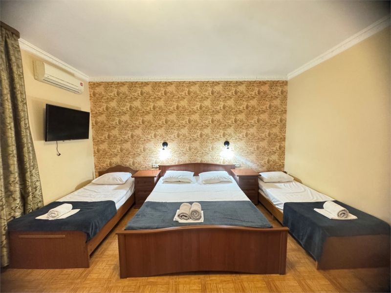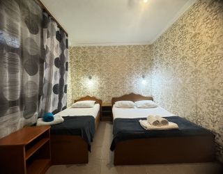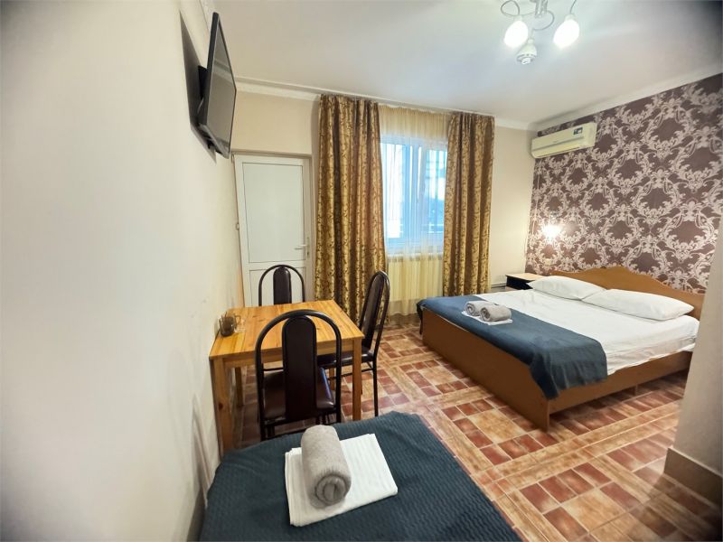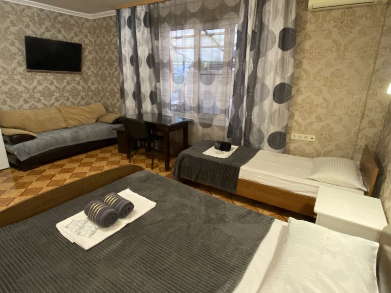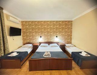Четырехэтажный корпус гостевого дома вмещает уютные 2-х, 3-х, 4-х, 5, и 6-местные номера, которые оформлены в классическом стиле в светлых и теплых тонах. В каждом номере есть ЖК-телевизор, холодильник, сплит-система, безлимитный интернет и собственная ванная комната с душем.