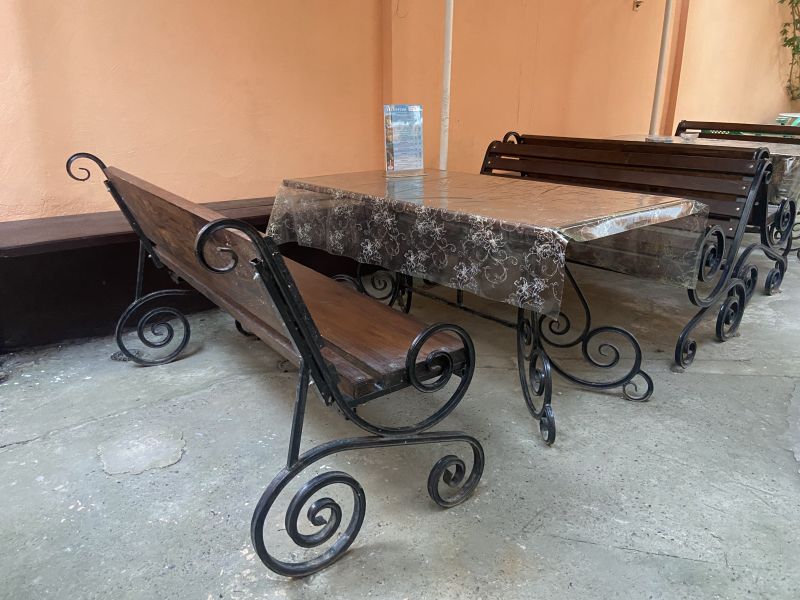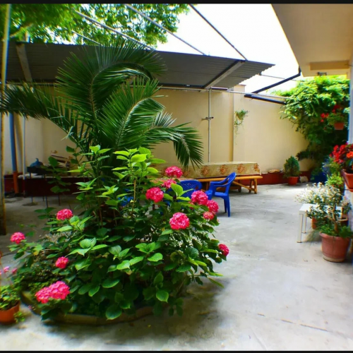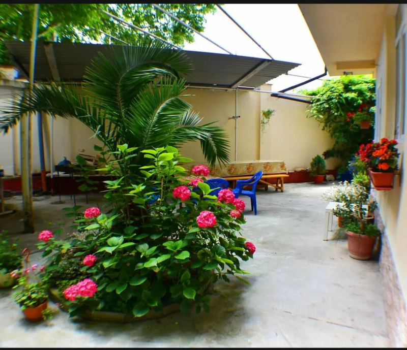 Общая кухня оборудована необходимыми кухонными приборами, набором посуды и обеденным столом. К гостевому дому прилегает территория с цветочными клумбами.